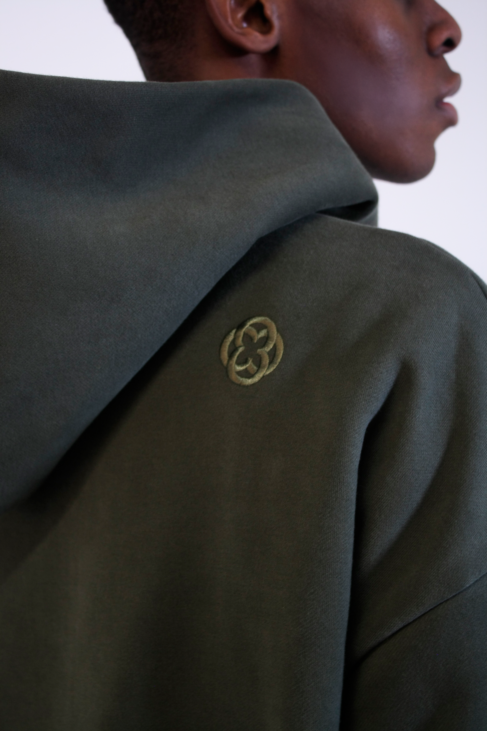 Sudadera de grosor elevado (500 GSM) con capucha, corte recto e interior ultra suave. Fabricada en Portugal. Logo frontal discreto y un parche trasero en el hombro.